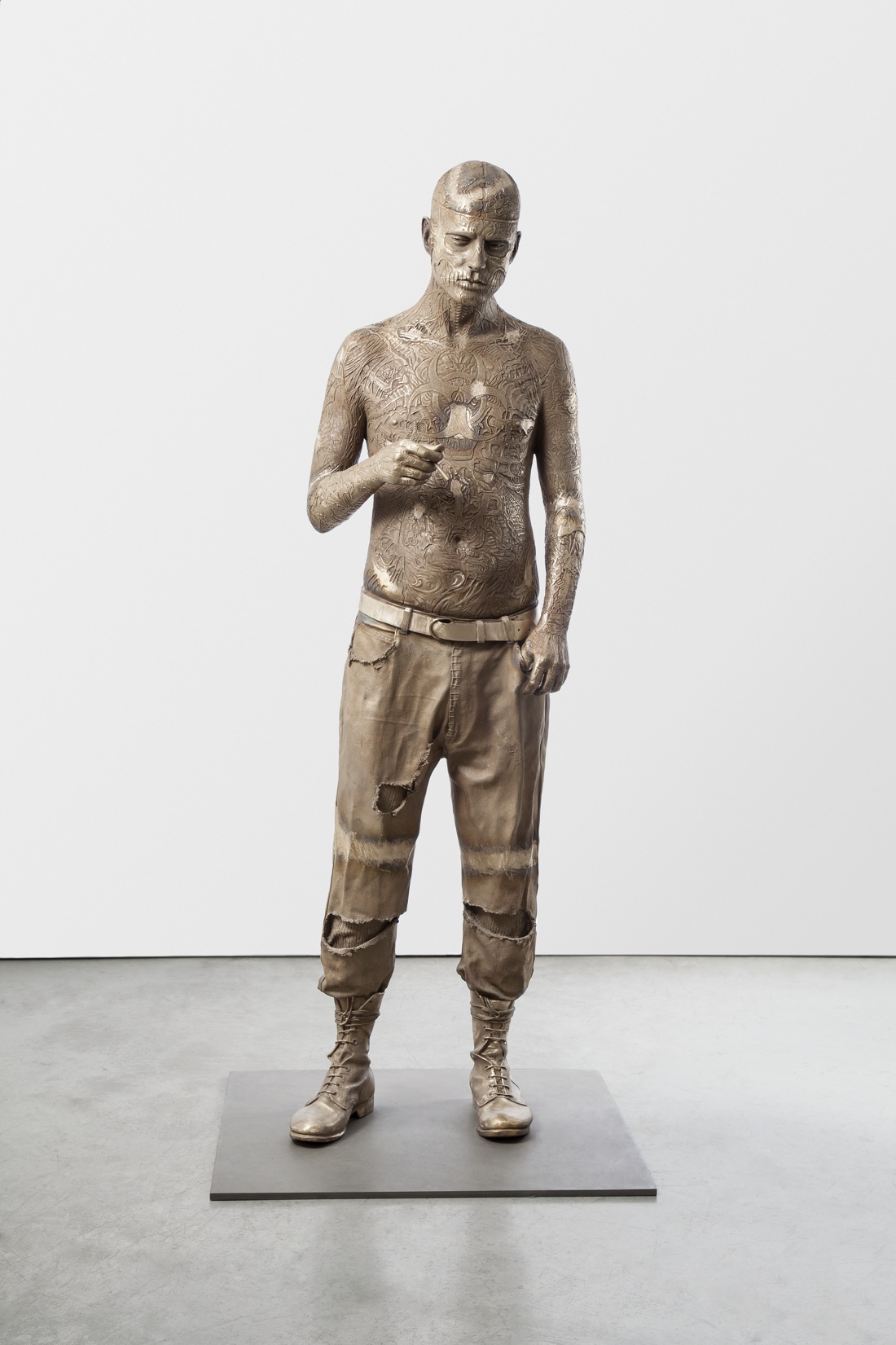 This work is a portrait of Rick Genest, whose body is largely covered with intricate tattoos of the human skeleton. It “presents the opposite of abstract flesh – a human body that has been modified and recreated to the point of becoming a self-authored artwork. Under the moniker Zombie Boy, Genest’s full-body tattoos have made him an international celebrity, appearing in music promos, films and fashion campaigns. In distinguishing him to the ultimate degree, he has created a brand founded purely on the resonance of his aesthetic. In Quinn’s sculptural portrait, Genest smokes a cigarette, human and mundane, the ink of his tattoos rendered in relief, making him appear like a colourless version of one of one of the wax écorché models often presented in relaxed lifelike poses for 18th century anatomy students.”