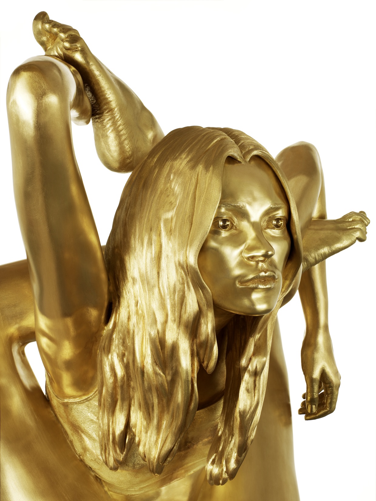 This sculpture deals with the idealised unreal image of the idolised body. It depicts the fashion model Kate Moss who became a media icon for our age. Presented in contorted yoga poses, the work explores the idea of Moss as an abstraction, an idealised figure who is more of a cultural hallucination than an actual person of flesh and blood. It is cast in solid 18 carat gold. Quinn says of the work, "Human beings often create images, begin to worship them and then forget the images were initially invented by them. They are left with an abstract image that is impossible to measure up to. This is the basis of all celebrity and religious imagery. Gold is a metal that humans have decided is one of the most valuable materials in the world, but like their invented images of perfection, gold itself is a belief system - inherently no more valuable than any other metal.” By casting this work in gold, Quinn creates an image of all the impossible dreams that lure people to wreck their lives on the rocky shore of reality - the ultimate hallucination which drives humans to madness." When this sculpture was shown in the British Museum in 2008 alongside its classical antecedents, it also coincided with the beginning of the global financial crisis, thus further emphasising the fragility of all these belief systems.
